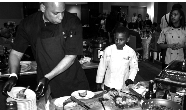 Chef Walter Brooks and a young aspiring chef cooking at the annual Chefs of the World Dinner, benefitting the National Black College Hall of Fame